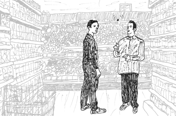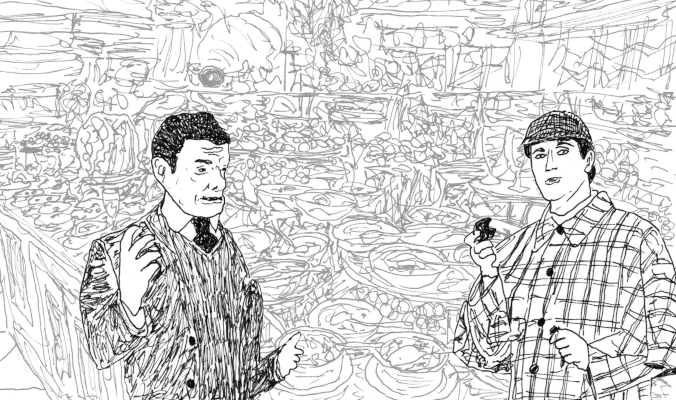 (English) Restless work makes people hungry, which is why the host has provided a sumptuous buffet. Heinz is the only one who passes up the delicacies. Helmut is amazed not only by this, but also by the fact that his companion makes an accurate prediction. |