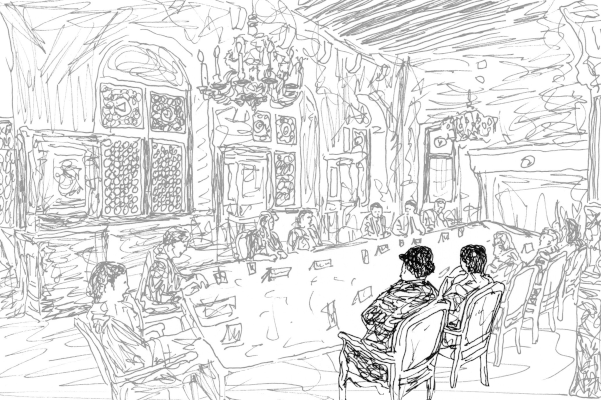 (Italiano) Baskerville Hall è un po' diversa da come i Ragazzi l'avevano immaginata, soprattutto a causa di alcuni altri ospiti che hanno stanze nella casa. Vestiti con gli autentici abiti di Holmes e Watson, si uniscono alle dieci persone che si sono riunite al grande tavolo della sala dei cavalieri. |