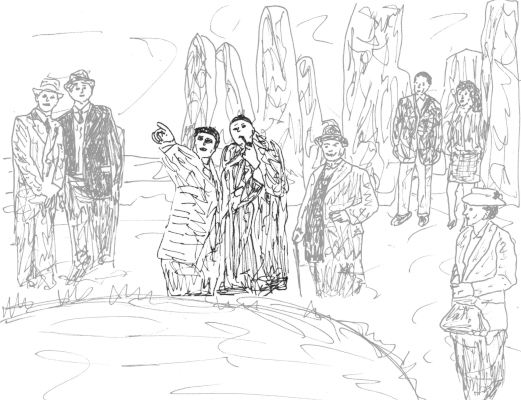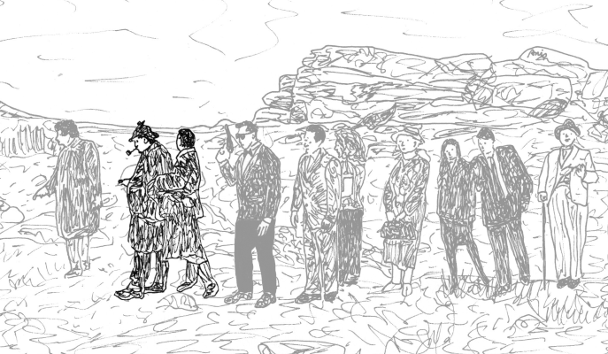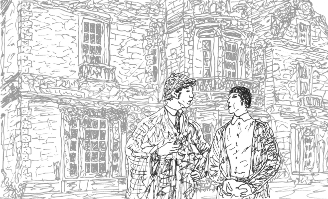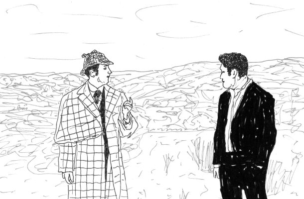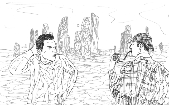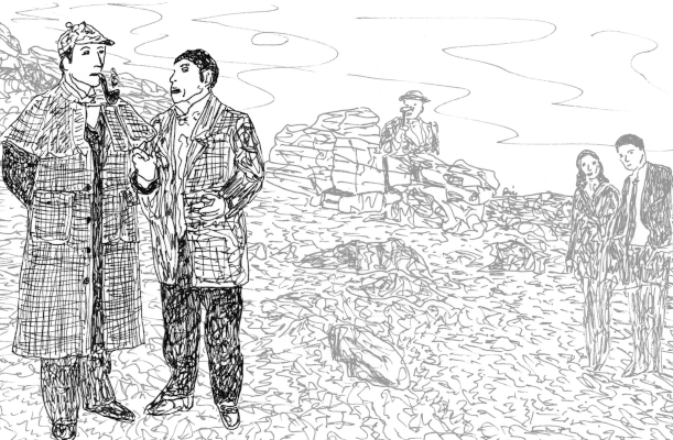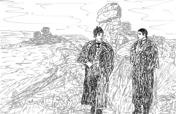 (English) The hunt begins. The group of master detectives pours out into the moor to get a picture of the surroundings and to look for clues. Holmes is the first to find something, something very old. Then he finds something newer. A good omen, Heinz thinks. |