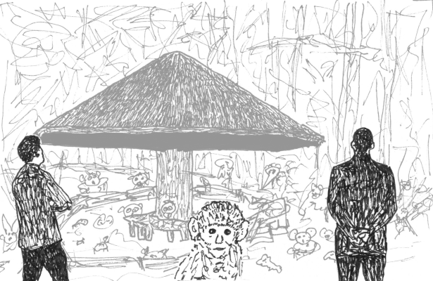 (English) After the wildlife experience under the mushroom, the two make themselves comfortable in Hedu's house. Helmut explains his fears about the monkey to Heinz. When Heinz shows himself to be less pessimistic than his friend, Helmut notices a certain similarity. |