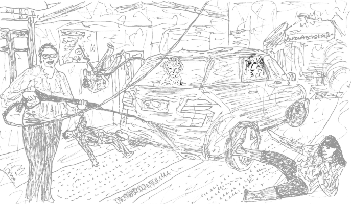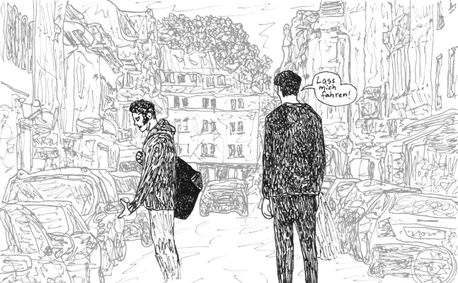 (Italiano) Poco prima di raggiungere Marsiglia, Helmut, seguendo una voce interiore, insiste improvvisamente affinché Heinz giri. Heinz cerca di capire l'intuizione di Helmut analizzandola, ma non va molto lontano prima che la cosa si chiarisca da sola. |