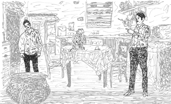 (English) Before he follows the clue that takes him back to Aouda, Heinz writes his elf report on the computer. Helmut interrupts him to say that he now knows more about his mysterious method and gives another example of his art. |