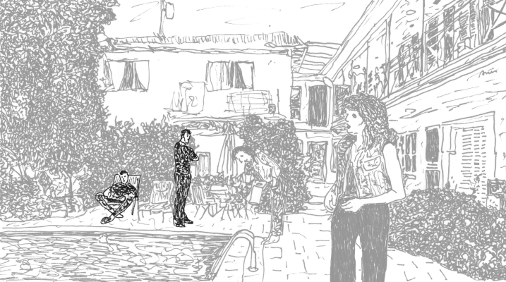 (English) Courtyard apartments with shared courtyards are a typical feature of Los Angeles architecture. In their free time, neighbors sometimes sit together and enjoy the Californian lifestyle by the pool. The Boys also get to experience this. |