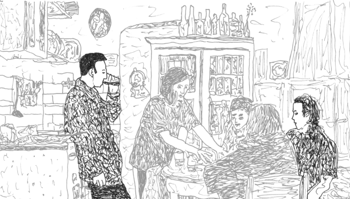 (Italiano) Mentre lavora con Sebastian al libricino sulla lingua Tongva, Tamet sente che, dopo una settimana intensa, sta raggiungendo i suoi limiti. Quindi oggi se ne va prima del previsto e lascia Heinz e Helmut ai loro pensieri. |
