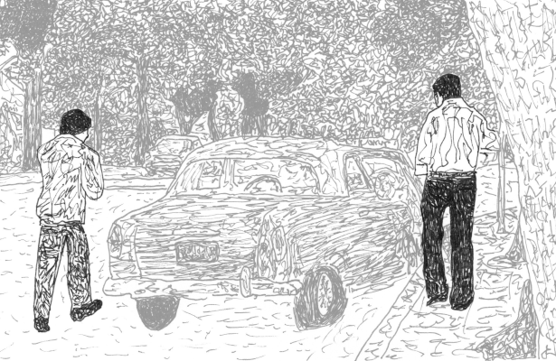 (English) It is no longer Helmut sitting next to Heinz in the car, but Tamet, who suggests finishing the route to Santa Monica. He remembers the old days and is shocked by what he sees passing by outside the window. |