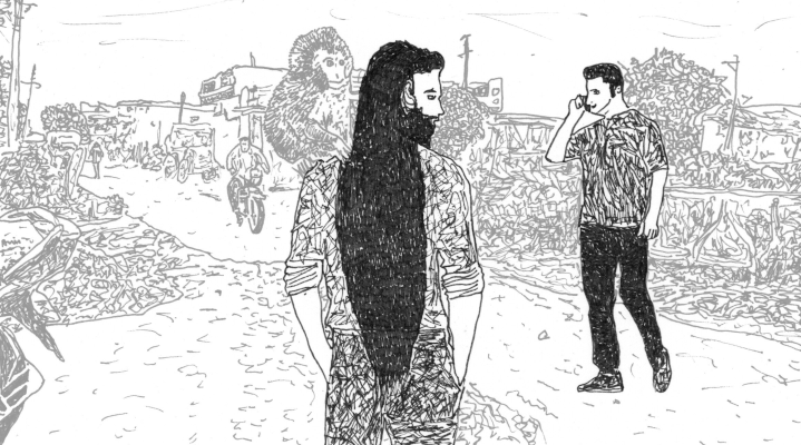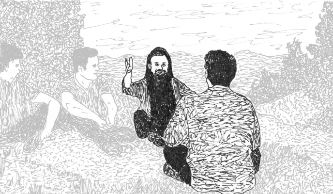 (English) While Aouda and Bobo are surveilling the monkeys at the camp and the search for Rupert isn’t making any progress, the next day the Boys, at Helmut’s request, set out toward the ashram, about an hour away on foot, to see Guru Mahirashi. |