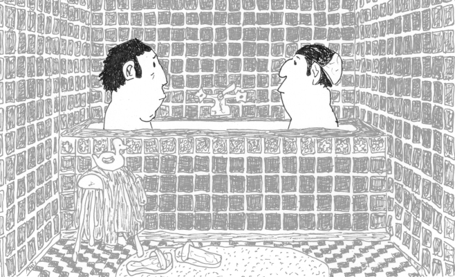 (English) Heinz and Helmut find themselves sitting opposite each other in Heinz’s bathtub. Helmut is trying out a bath additive, while Heinz needs more hot water. He repeatedly insists on his domestic authority, but listens carefully to what his friend has to say. |