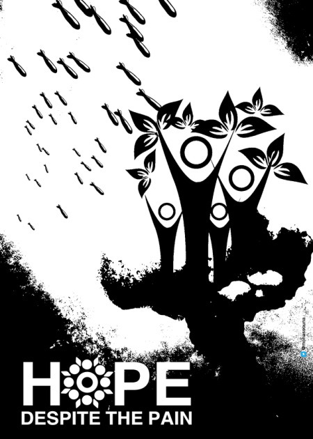 Question 5: Left for me is to point to your [Munich fundraising page], your facebook page and to direct those readers, who want to purchase your posters, to [this page]. Despite all my arts it is impossible for me to put myself in your position, and many of us feel helpless and petrified in view of this madness. But only we can bring about change, nothing will start on its own. Your closing word?