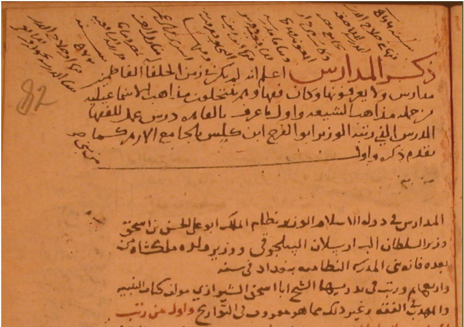 | 8. Man sieht ganz oben einige quer eingefügte Zeilen, dann fünf Zeilen in Maqrisis Handschrift und schließlich den Rest des Blattes in einer Schrift, von der Bauden behauptet, dass sie Auhadi gehört – der Name fiel bereits im Zusammenhang mit Sachaawi, siehe oben. Bei genauem Hinsehen erkennt man überdies, dass zwischen den beiden Teilen eine Lücke ist, in der man Reste einer ausgewaschenen und getilgten Textstelle ausmachen kann. Die Seite – von rechts nach links zu lesen – handelt übrigens von den Madrasas in Kairo, also den muslimischen Lehr-Instituten. |