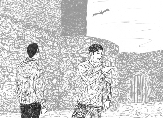 (Italiano) Prima di entrare nel castello, i due danno un'occhiata al giardino, camminando lungo il muro dell'edificio. La flora e la fauna fanno subito capire loro che non si tratta di un luogo comune, soprattutto Helmut, che mantiene il sangue freddo. |