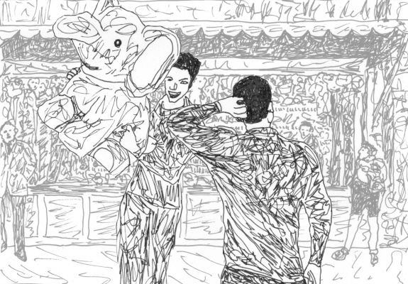 Pink Elephant Day 5 Helmut: A fairground. Well, that surprises me. Oh, there you can throw at cans. Come on, Heinz, this is a home game for you! |