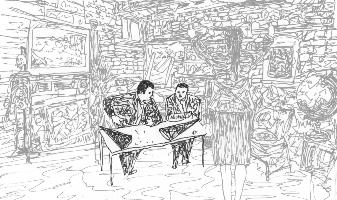 (Italiano) Il buco che Helmut ha segato nella porta rossa ora fa da finestra ai Ragazzi. Guardano con attenzione cosa succede dall'altra parte della porta, finché Helmut non mette insieme i pezzi e ha un'illuminazione che cambia tutto. |