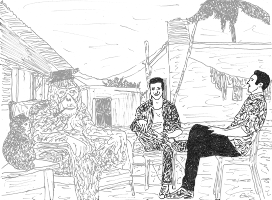 (English) Heinz has been lying sick in his room at the camp for two days because of a yogurt drink he didn’t tolerate. The little monkey Aouda is taking very sweet care of him. Helmut comes in after having been in the village and tells his friend the latest news. |