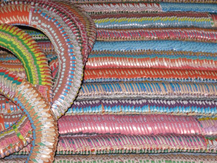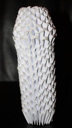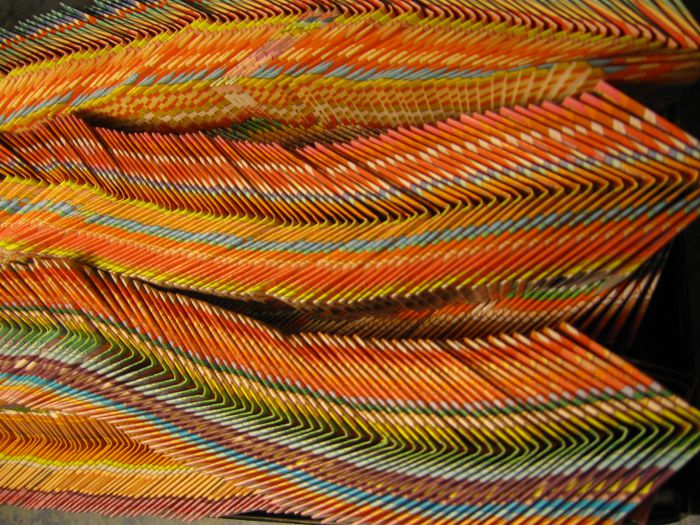(Deutsch:) (23.12.2014) Als ich Origami-Dreiecke entdeckte, war ich fasziniert. Kleine Einheiten, die man nach dem Lego-Prinzip zusammenstecken kann. Als ich tausend City-World-Poster übrig hatte, die zu hell aus der Druckerei kamen, verarbeitete ich sie innerhalb von zwei Jahren in Origami-Dreiecke und baute daraus Matten, Säulen und Eier. Zum Jahresende 2014 produzierte ich dann dieses Video (rechts) und schrieb dafür die Musik („The Strolling Worker“). Das Video erklärt, wie es geht, und zeigt die schönsten Fotos. |